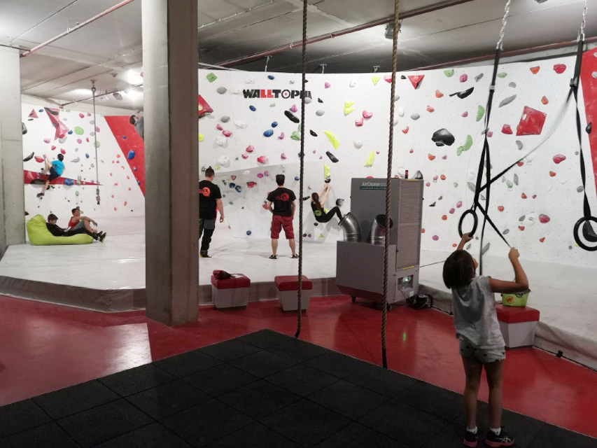 Magnesite powder is commonly used in climbing gyms to allow a better grip on the climbing wall. The airborne dust is inhaled by the occupants of the room causing potential respiratory problems and an experience of malaise on the busiest days. Moreover, the chalk dust, depositing itself on the equipment and on the surfaces of the room, requires constant cleaning operations.